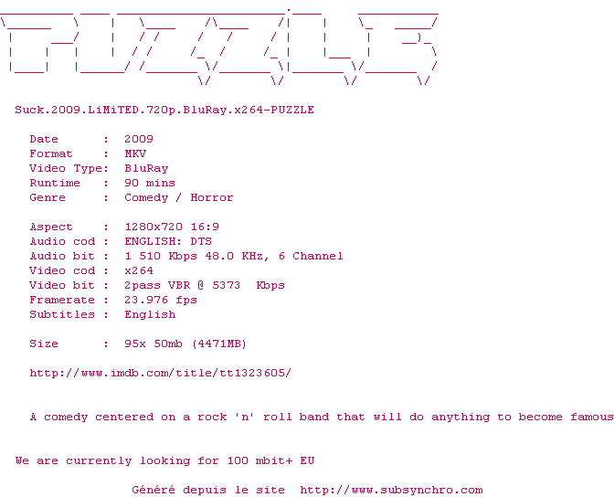 Telechargez le RSS « Fichier de la release Suck.2009.720p.BluRay.x264-PUZZLE »