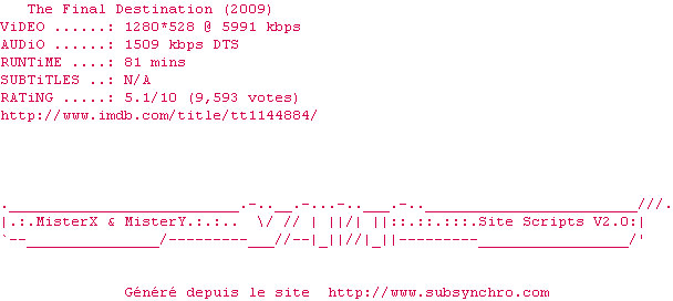 Telechargez le RSS « Fichier de la release The.Final.Destination.720p.BluRay.x264-METiS »