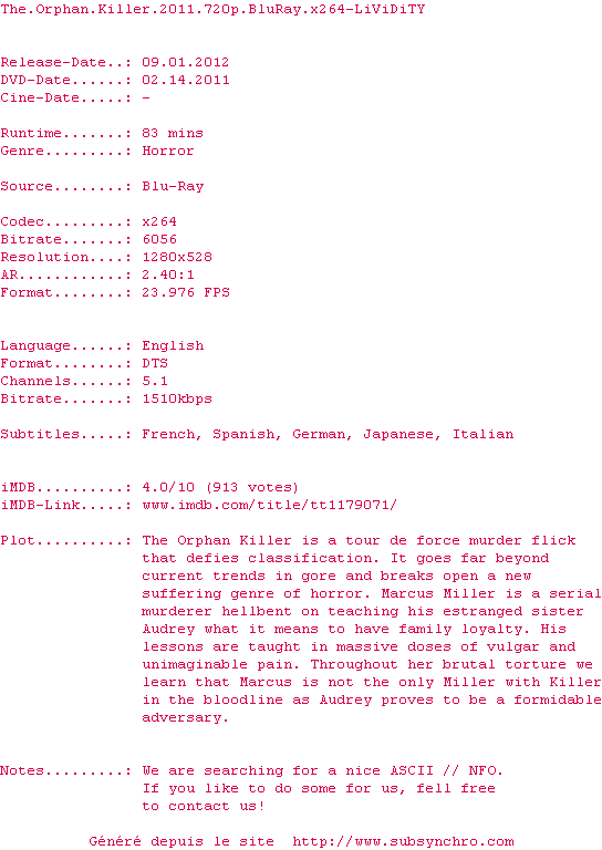 Telechargez le RSS « Fichier de la release The.Orphan.Killer.2011.720p.BluRay.x264-LiViDiTY »