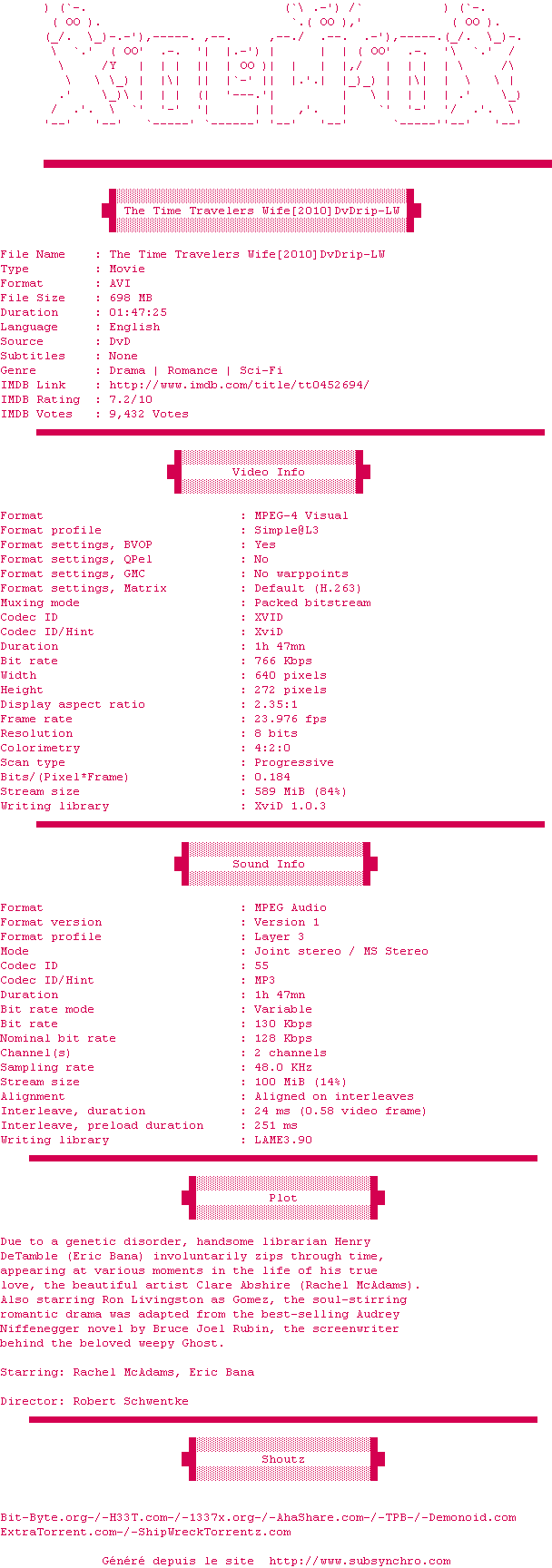 The.Time.Travelers.Wife.2010.DvDrip-LW.srt Ajouté par XeiS Ajoute le 31-01-2010 10:04:14 Format : SRT Italique : Non Taille : 0.00Ko Telechargement : 88 Sous-titre Extrait d'un DVD Z1 Ajouter cette release à ma collection en cas de telechargement des sous-titres 0 0 0 Telecharger le ZiP contenant NFO, Affiche, Sous-titre (*.srt) Commentez le fichier The.Time.Travelers.Wife.2010.DvDrip-LW.srt Commentez le fichier The.Time.Travelers.Wife.2010.DvDrip-LW.srt Commentez ce fichier Le fichier 52-1264928654.srt n'existe pas ! Telechargez le RSS « Fichier de la release The.Time.Travelers.Wife.2010.DvDrip-LW » Retour au film « Hors du temps »