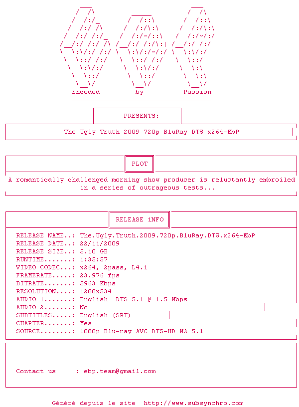 Telechargez le RSS « Fichier de la release The.Ugly.Truth.2009.720p.BluRay.DTS.x264-EbP »