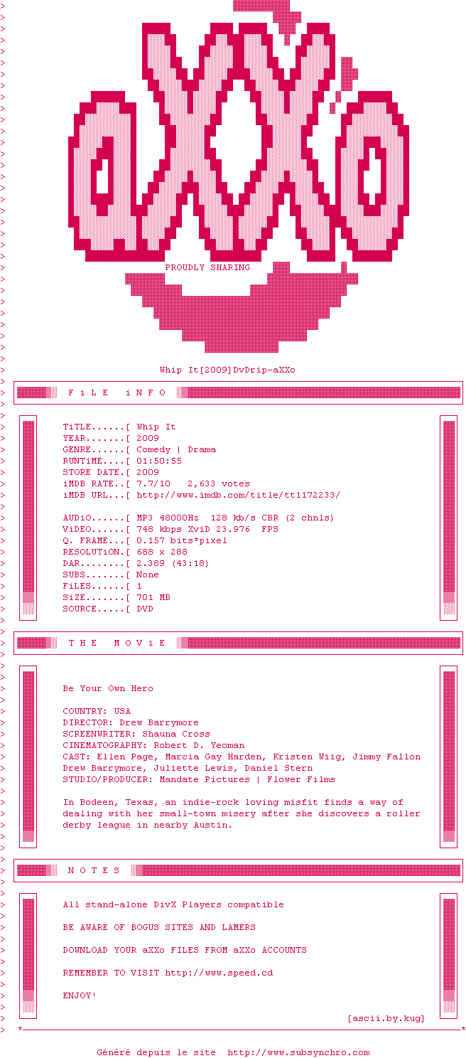 Telechargez le RSS « Fichier de la release Whip.It.2009.DvDrip-aXXo »