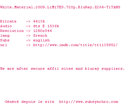 Telechargez le RSS « Fichier de la release White.Material.2009.LiMiTED.720p.BluRay.x264-TiTANS »