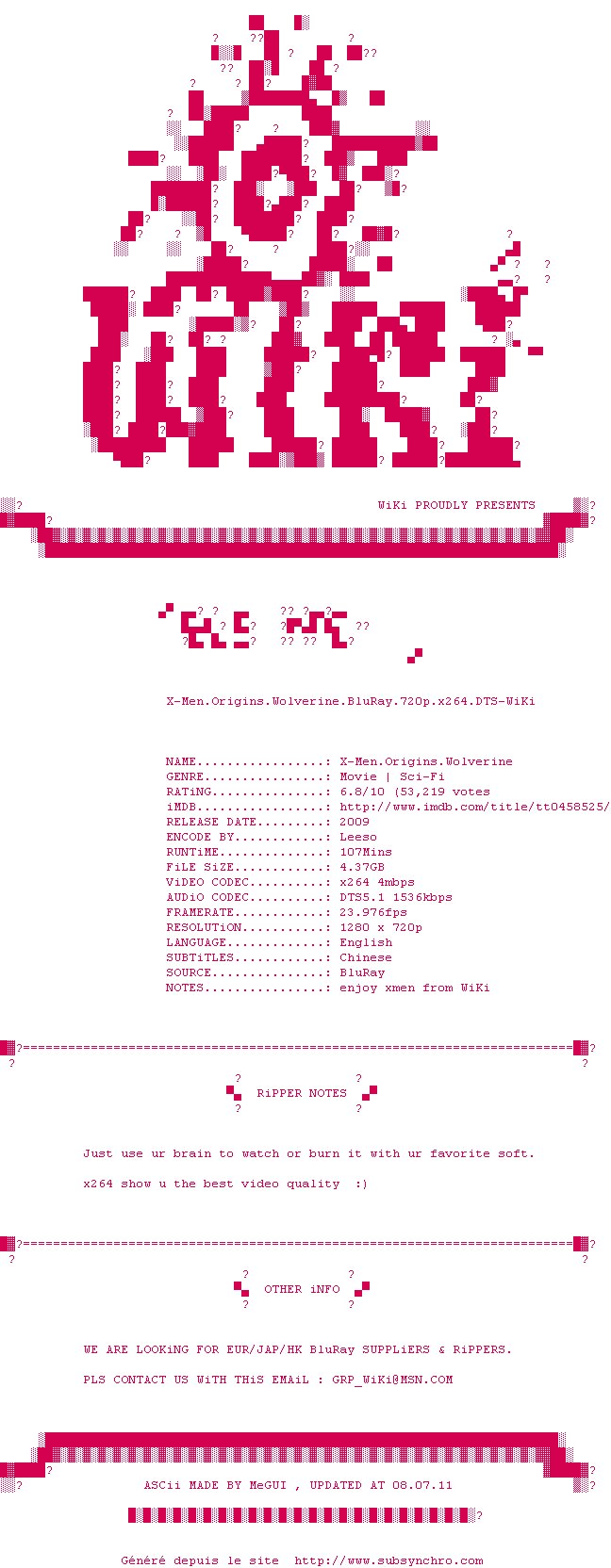 Telechargez le RSS « Fichier de la release X-Men.Origins.Wolverine.BluRay.720p.x264.DTS-WiKi »