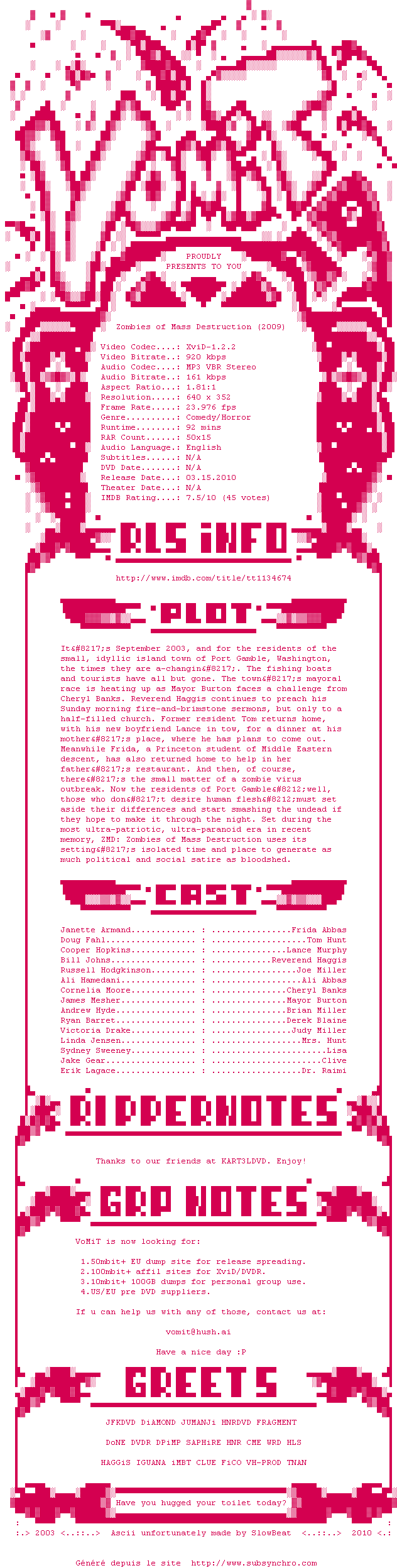 Telechargez le RSS « Fichier de la release Zombies.Of.Mass.Destruction.2009.DVDRip.XviD-VoMiT »