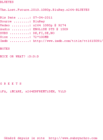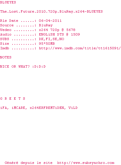 Voir le nfo de la release The.Lost.Future.2010.720p.BluRay.x264-BLUEYES