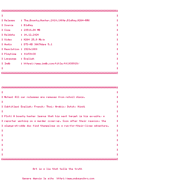 Voir le nfo de la release The.Bounty.Hunter.2010.1080p.BluRay.H264-RMX