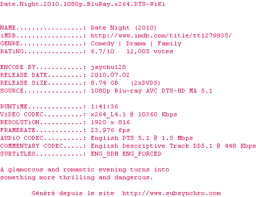 Voir le nfo de la release Date.Night.2010.1080p.BluRay.x264.DTS-WiKi