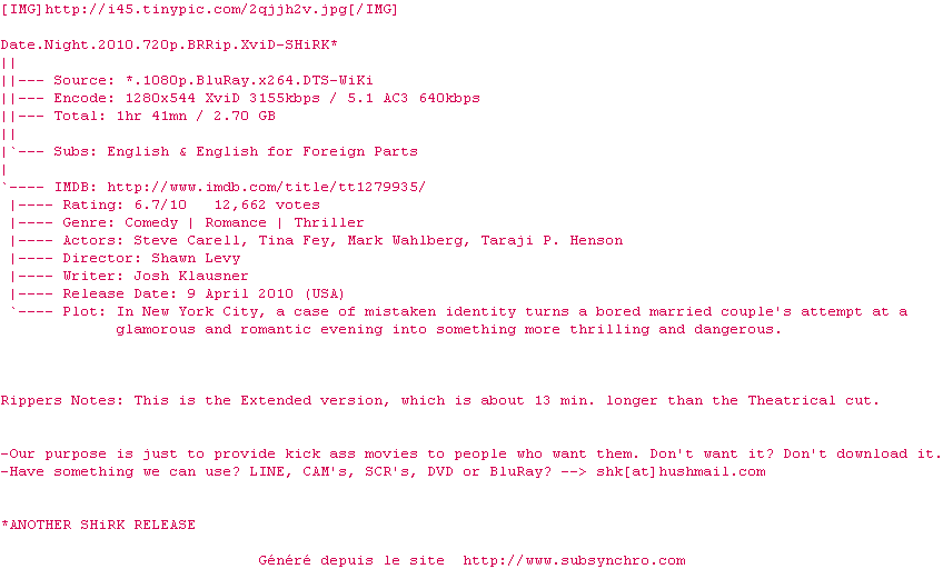 Voir le nfo de la release Date.Night.2010.720p.BRRip.XviD-SHiRK