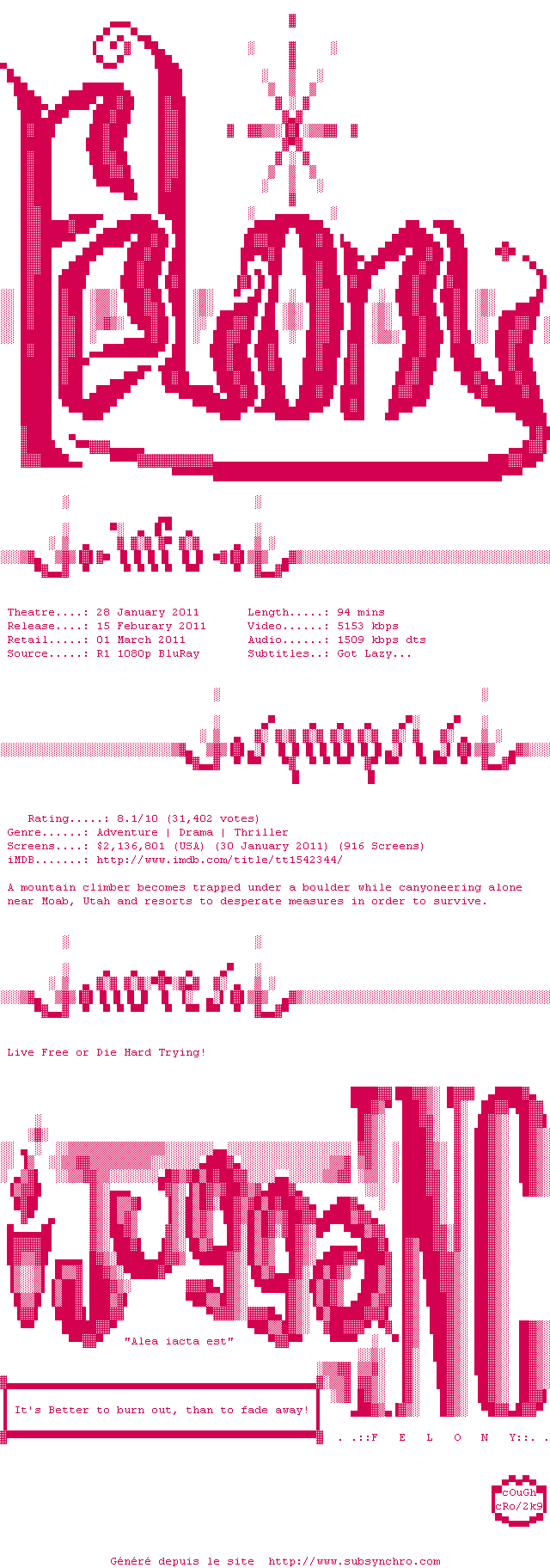 Telechargez le RSS « Fichier de la release 127.Hours.2010.720p.BluRay.x264-Felony »
