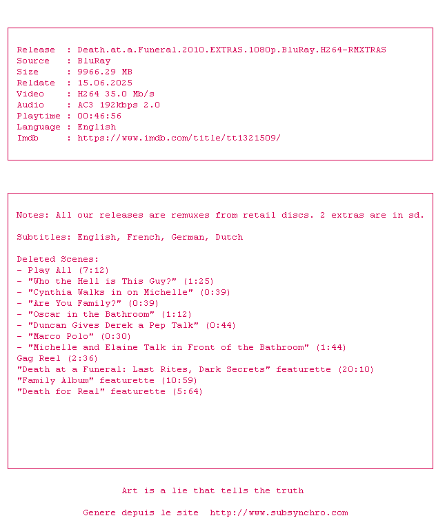 Voir le nfo de la release Death.At.A.Funeral.2010.EXTRAS.1080p.BluRay.H264-RMXTRAS