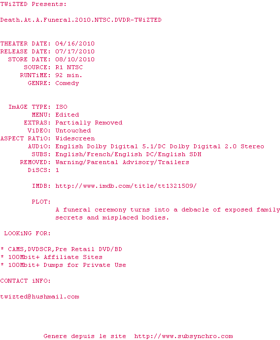 Voir le nfo de la release Death.At.A.Funeral.2010.NTSC.DVDR-TWiZTED