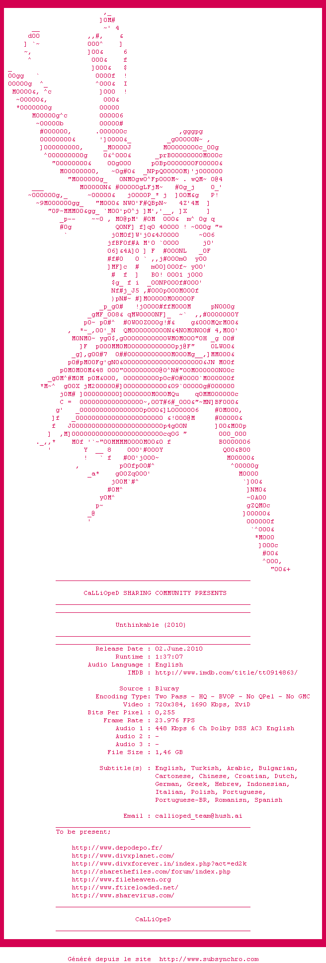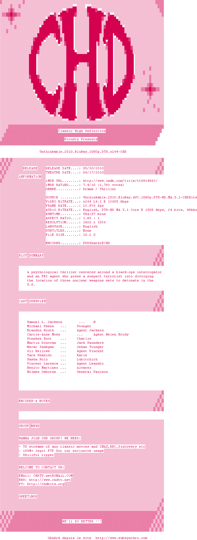 Le commentaire de Takuandaichi Commente par Takuandaichi (49), Le Jeudi 21 Janvier 2016 à 04h09 Un thriller atroce, immonde, haletant, ignoble et génial. Une (ou plusieurs) situations qui ont (peut-être) déjà eu lieu, un Samuel L Jackson que vous ne retrouverez jamais aussi intense, à part peut-être dans certains Tarantino, Carrie Ann Moss comme je ne l'avais jamais vu et de nombreux rôles secondaires que vous reconnaîtrez sans doute, jouant impeccablement leurs rôles. Un presque huis-clos rappellant l'excellent Garde à Vue avec Ventura et Serrault (en moins parfait cinématographiquement parlant), mais attention, en plus graphique et plus dur, pour la simple et bonne raison qu'il traite de terrorisme moderne, et non d'un "simple" crime pédophile. Je crois qu'il s'agit d'un des films les plus intenses que j'ai pu voir (oui, même en le comparant à un Apocalypse Now, contrairement à celui-ci le rythme est presque insoutenable par moment) Etrangement, depuis les attentats de Paris, ce film est encore plus d'actualités qu'il ne l'était à sa sortie. A ne pas mettre entre toutes les mains. Mais à voir une fois dans sa vie. 8.5 / 10 Le commentaire de ahuribarbu Commente par ahuribarbu (106), Le Mardi 26 Janvier 2016 à 20h56 Envie d'ajouter quelques éléments à cet excellent commentaire. Tout d'abord attention âmes sensibles. De plus ce film traite admirablement de ce qu'on obtient comme renseignements sous la torture. Je trouve que c'est un film politique très engagé et vraiment d'actualité, comme tu le dis si bien, avec les attentats de Paris. Ce film soulève non seulement l'inacceptabilité de l'acte terroriste mais je trouve aussi l'inacceptabilité de notre responsabilité et de nos réactions. 1 0 1 0