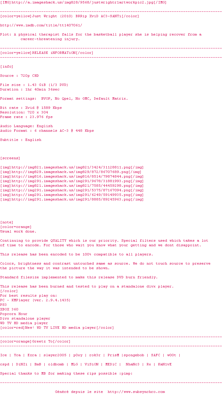Voir le nfo de la release Just.Wright.2010.BRRip.XviD.AC3-SANTi