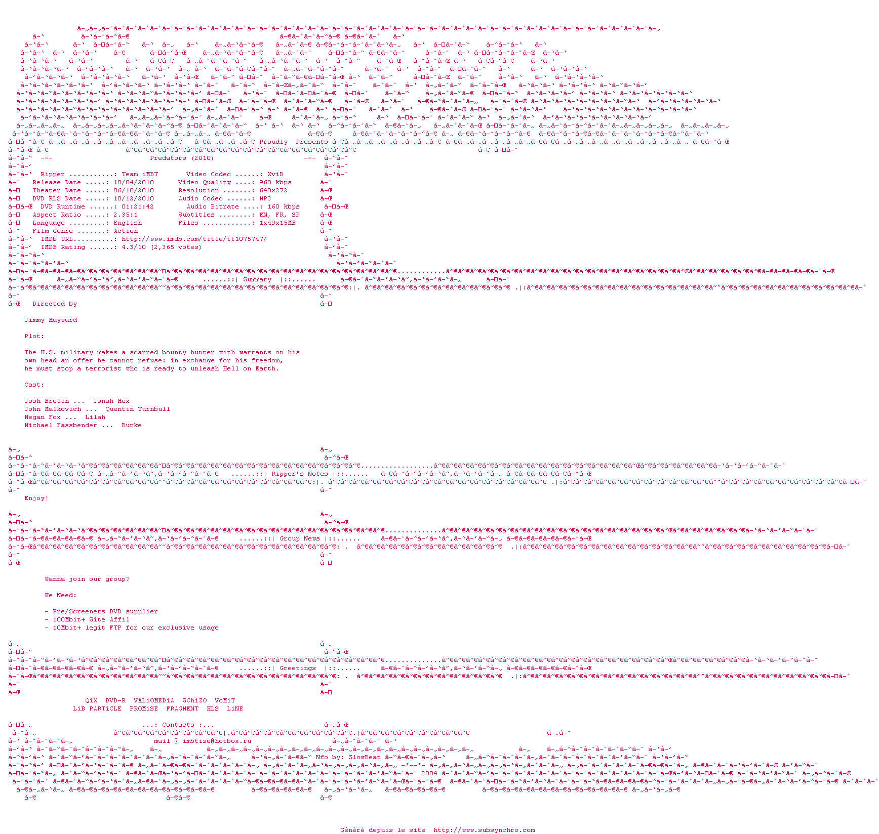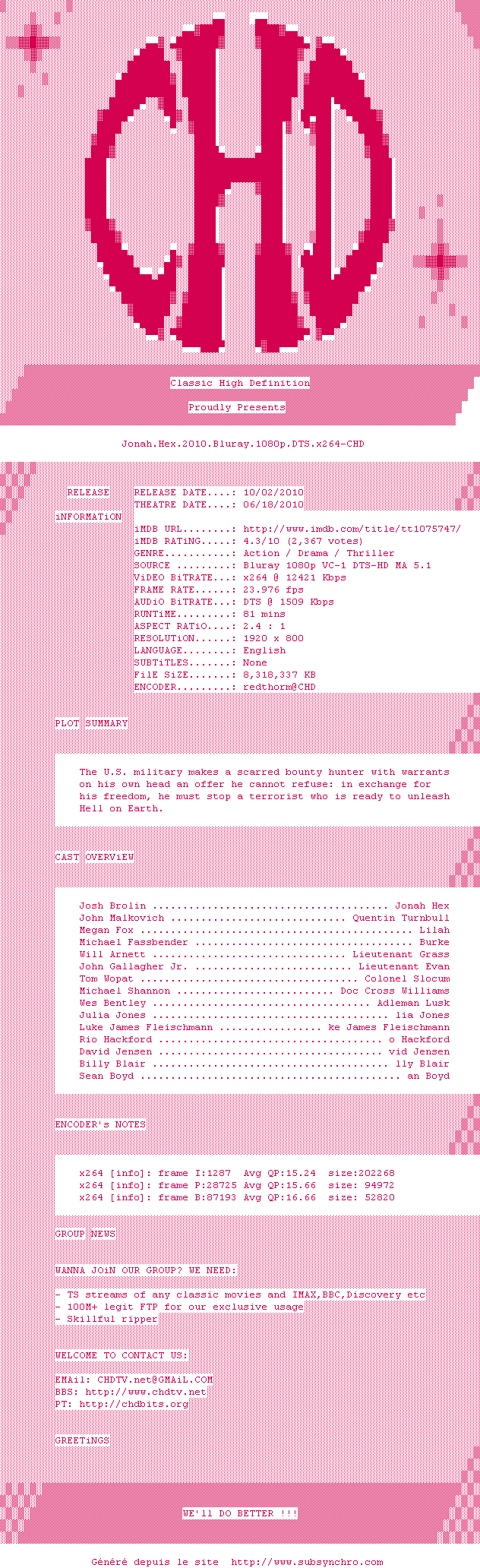 Voir le nfo de la release Jonah.Hex.2010.Bluray.1080p.DTS.x264-CHD