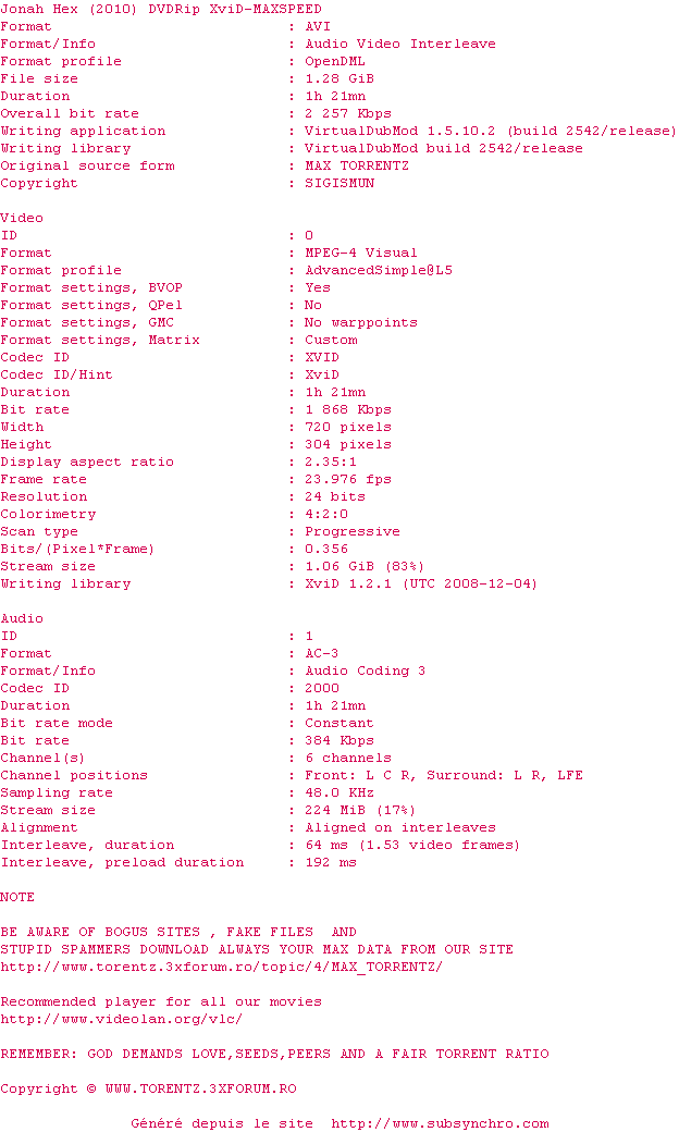 Voir le nfo de la release Jonah.Hex.2010.DVDRip.XviD-MAXSPEED