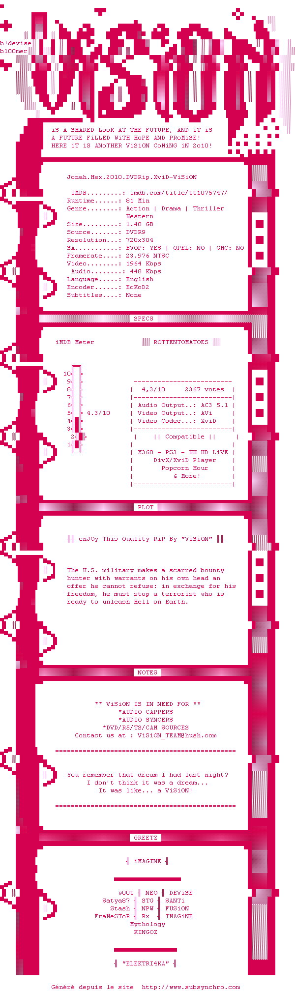 Voir le nfo de la release Jonah.Hex.2010.DVDRip.XviD-ViSiON