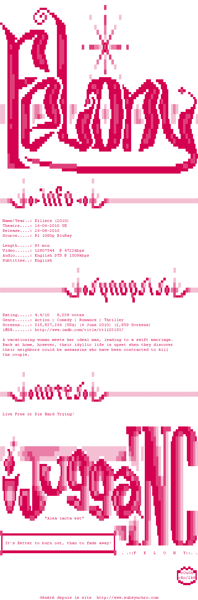 Voir le nfo de la release Killers.2010.720p.BluRay.x264-Felony