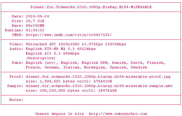 Y avez-vous pense ? Nous proposons déjà 1998 sous-titres pour le film The Dinner. Avez-vous essaye de voir si ces sous-titres etaient compatibles avec cette release ? On vous laisse le soin de tester cela pour nous et de contribuer au site en postant le sous-titre en cas de compatiblite constatee !