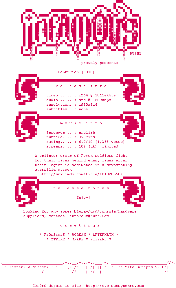 Voir le nfo de la release Centurion.2010.LiMiTED.MULTi.1080p.BluRay.x264-FHD