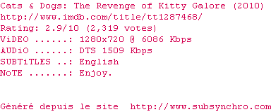 Voir le nfo de la release Cats.and.Dogs.The.Revenge.of.Kitty.Galore.720p.BluRay.x264-CROSSBOW
