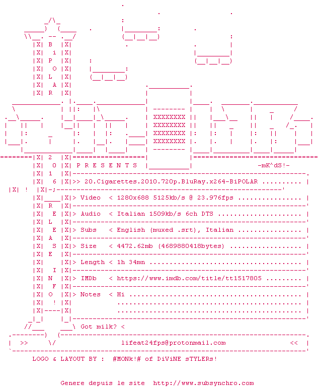 | Voir le nfo de la release 20.Cigarettes.2010.720p.BluRay.x264-BiPOLAR | BiPOLAR | 20.Cigarettes.2010.720p.BluRay.x264-BiPOLAR OpenSubtitles | 0 fichier | ||