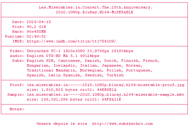 Y avez-vous pense ? Nous proposons déjà 1764 sous-titres pour le film Les Misérables in Concert: The 25th Anniversary. Avez-vous essaye de voir si ces sous-titres etaient compatibles avec cette release ? On vous laisse le soin de tester cela pour nous et de contribuer au site en postant le sous-titre en cas de compatiblite constatee !