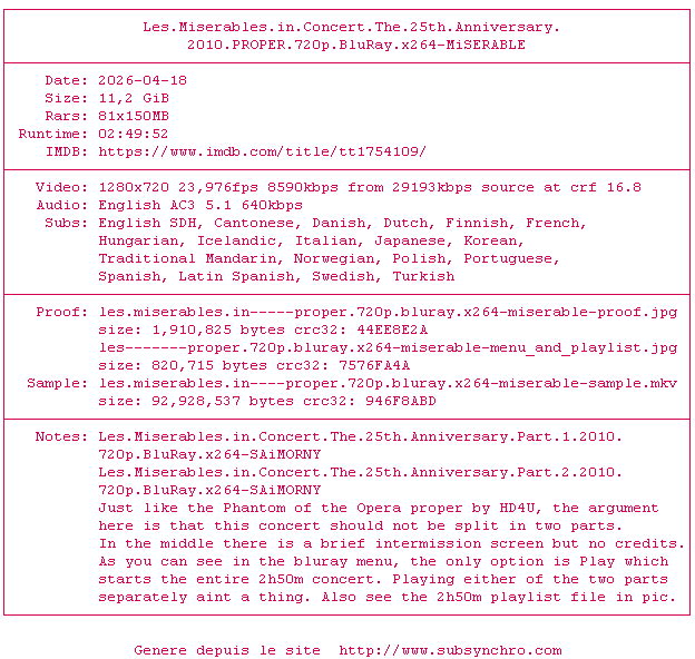 Y avez-vous pense ? Nous proposons déjà 1863 sous-titres pour le film Les Misérables in Concert: The 25th Anniversary. Avez-vous essaye de voir si ces sous-titres etaient compatibles avec cette release ? On vous laisse le soin de tester cela pour nous et de contribuer au site en postant le sous-titre en cas de compatiblite constatee !