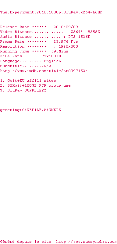 Voir le nfo de la release The.Experiment.2010.1080p.BluRay.x264-LCHD