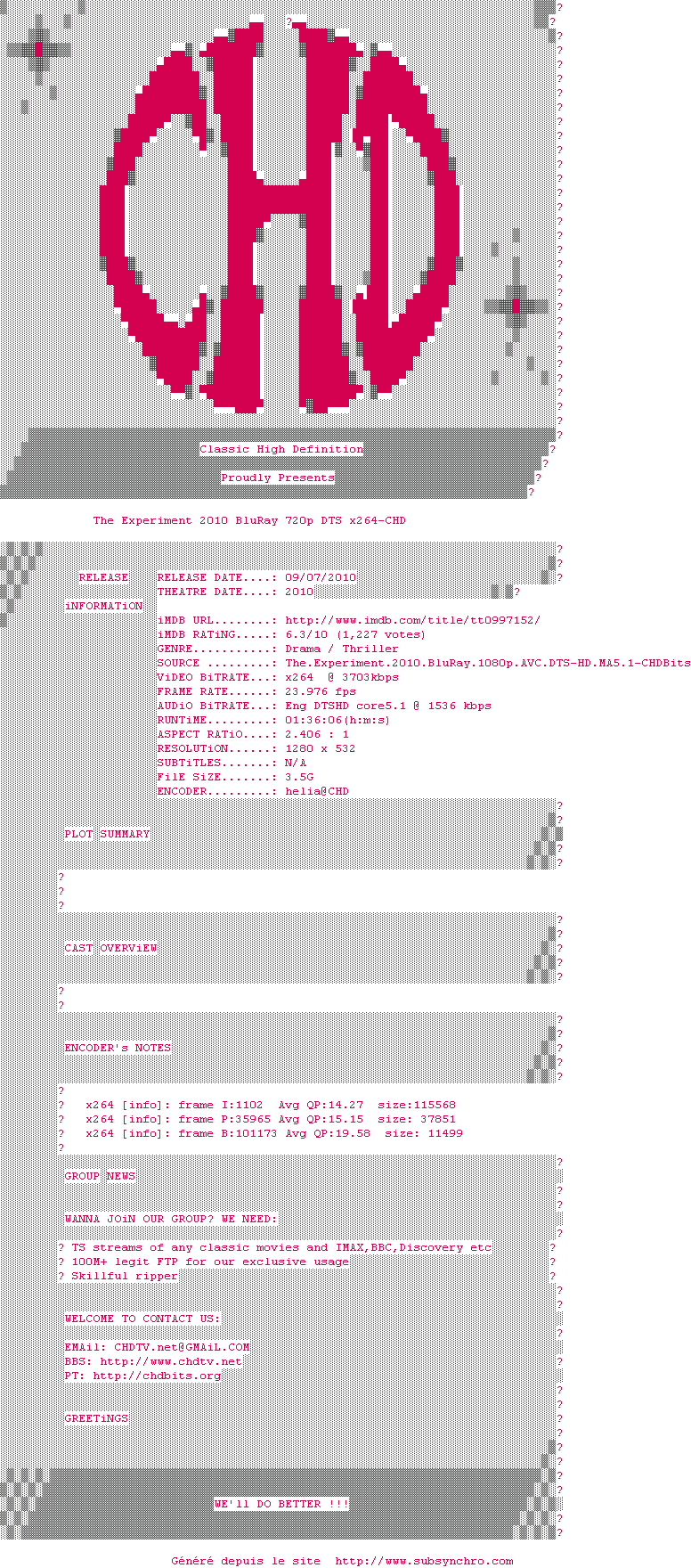 Voir le nfo de la release The.Experiment.2010.BluRay.720p.DTS.x264-CHD