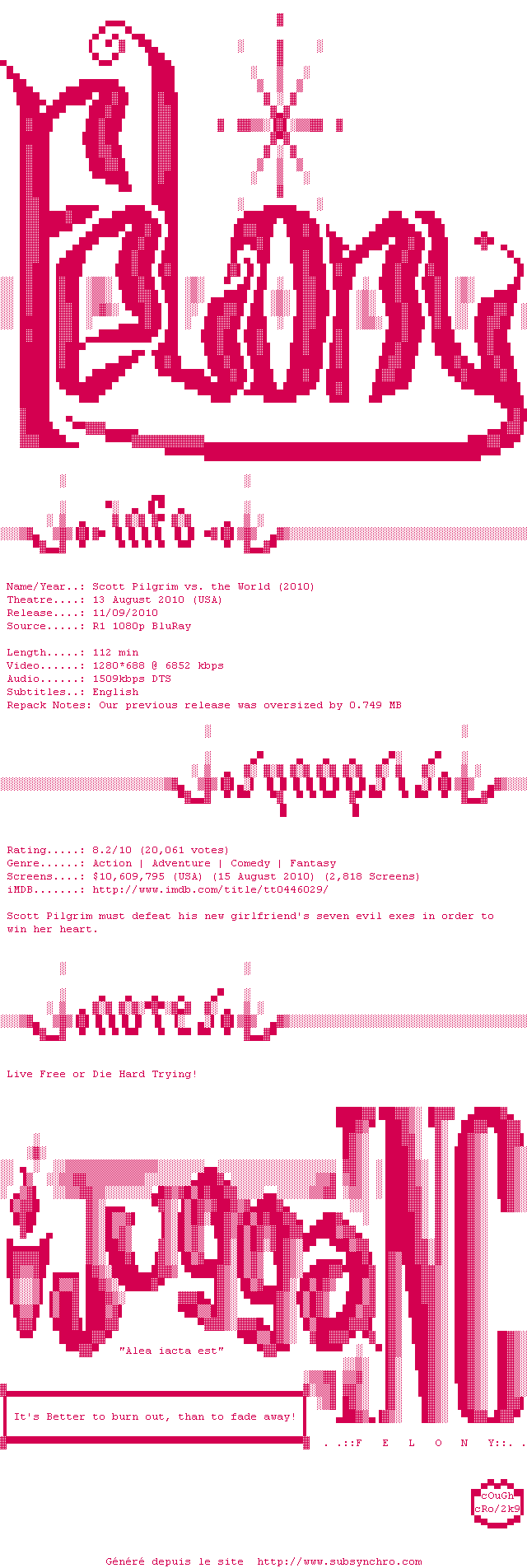 Voir le nfo de la release Scott.Pilgrim.Vs.The.World.2010.1080p.BluRay.x264-SECTOR7