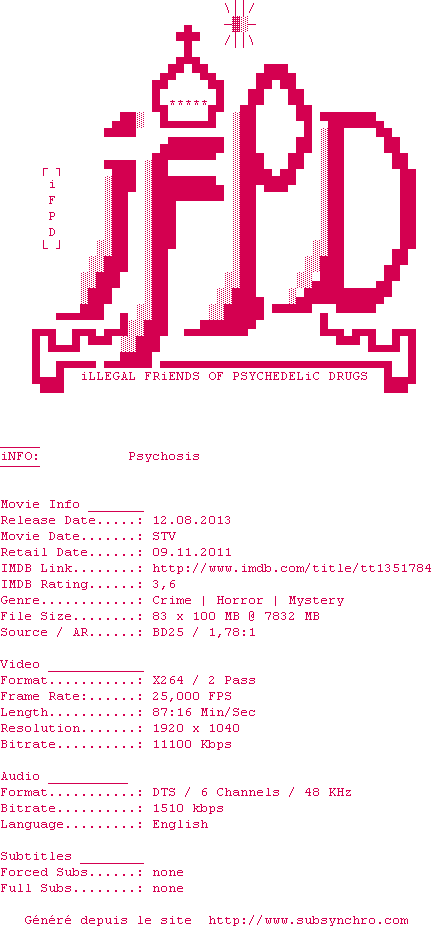 | Voir le nfo de la release Psychosis.2010.1080p.BluRay.x264-iFPD | iFPD | Psychosis.2010.1080p.BluRay.x264-iFPD OpenSubtitles | 0 fichier |