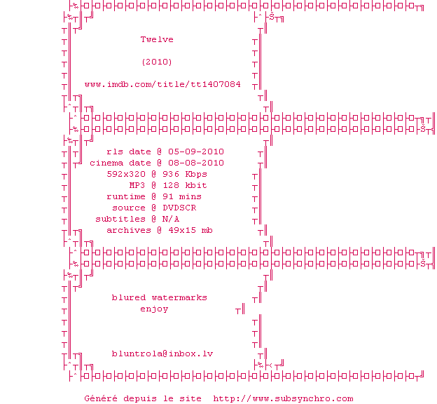 | Voir le nfo de la release Twelve.2010.DVDSCR.XviD-BLUNTROLA | BLUNTROLA | Twelve.2010.DVDSCR.XviD-BLUNTROLA OpenSubtitles | 0 fichier | ||