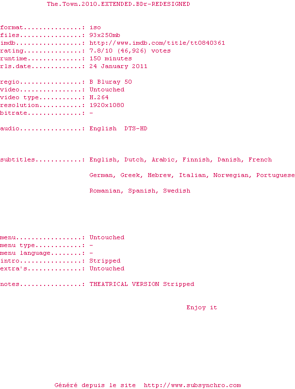 Voir le nfo de la release The.Town.2010.EXTENDED.BDr-REDESIGNED