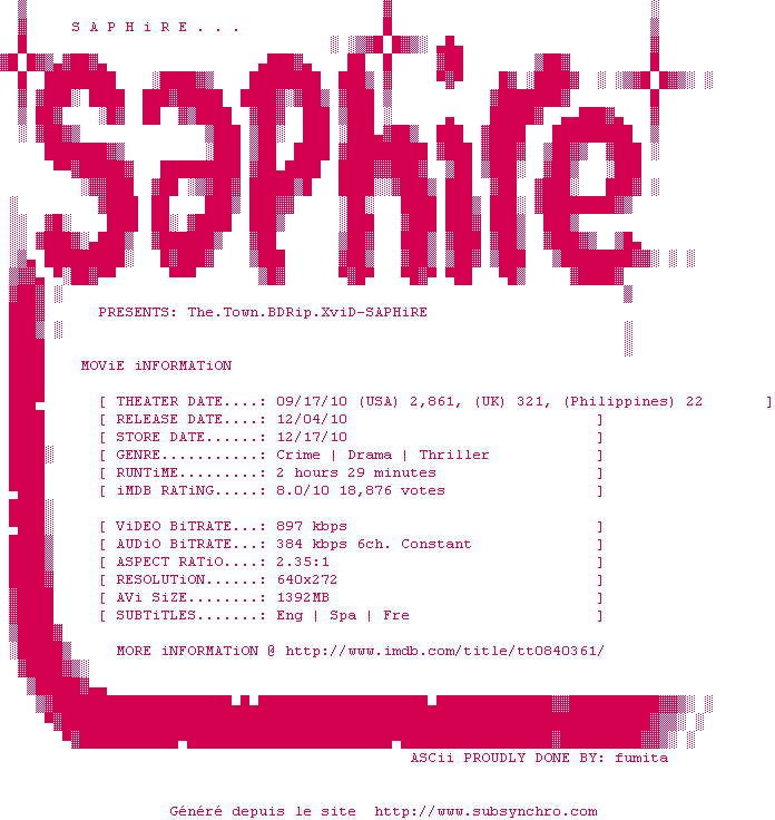 Voir le nfo de la release The.Town.EXTENDED.BDRip.XviD-SAPHiRE