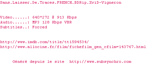 | Voir le nfo de la release Sans.Laisser.De.Traces.FRENCH.BDRip.XviD-Vigneron | Vigneron | Sans.Laisser.De.Traces.FRENCH.BDRip.XviD-Vigneron OpenSubtitles | 0 fichier |