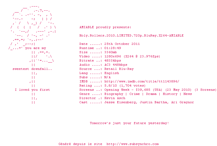 Voir le nfo de la release Holy.Rollers.2010.LIMITED.720p.BluRay.X264-AMIABLE