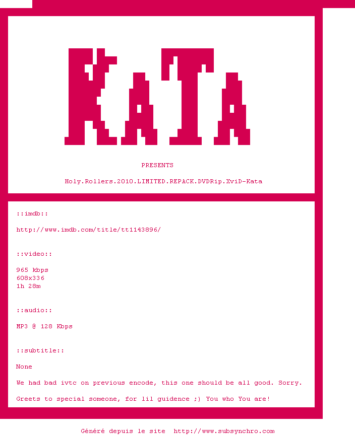 Voir le nfo de la release Holy.Rollers.2010.LIMITED.REPACK.DVDRip.XviD-Kata