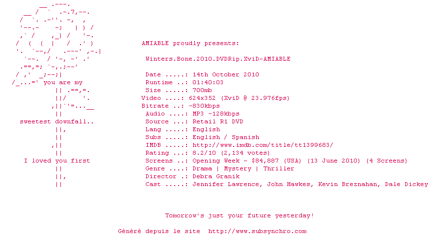 Voir le nfo de la release Winters.Bone.2010.LIMITED.DVDRip.XviD-AMIABLE