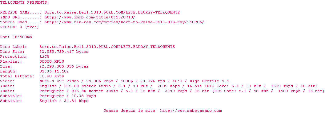 Voir le nfo de la release Born.To.Raise.Hell.2010.DUAL.COMPLETE.BLURAY-TELAQUENTE