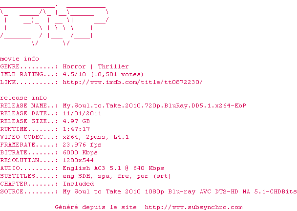 Voir le nfo de la release My.Soul.to.Take.2010.720p.BluRay.DD5.1.x264-EbP