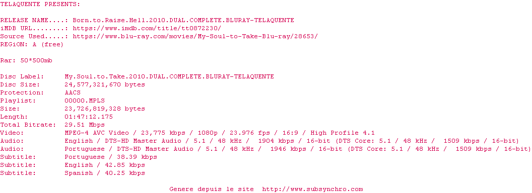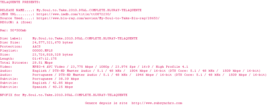 Voir le nfo de la release My.Soul.To.Take.2010.DUAL.COMPLETE.BLURAY.NFOFiX-TELAQUENTE