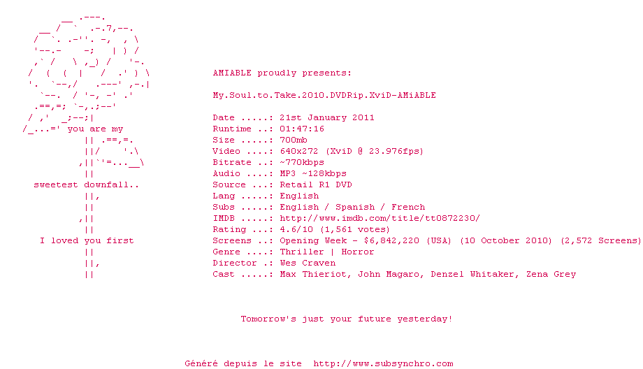 Voir le nfo de la release My.Soul.to.Take.2010.DVDRip.XviD-AMIABLE