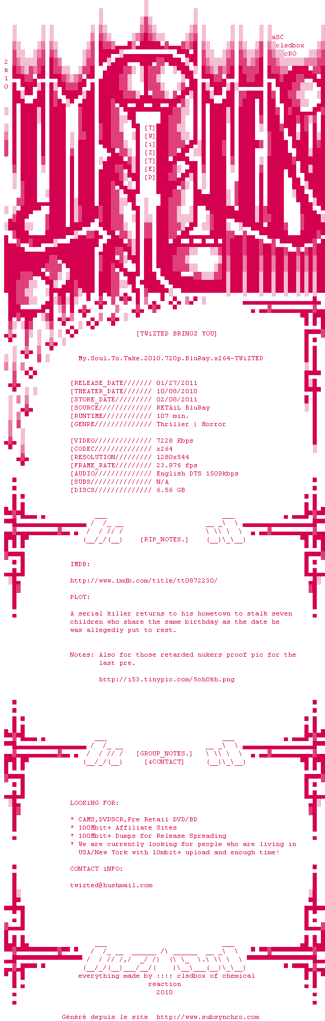 Voir le nfo de la release My.Soul.To.Take.720p.BluRay.x264-TWiZTED