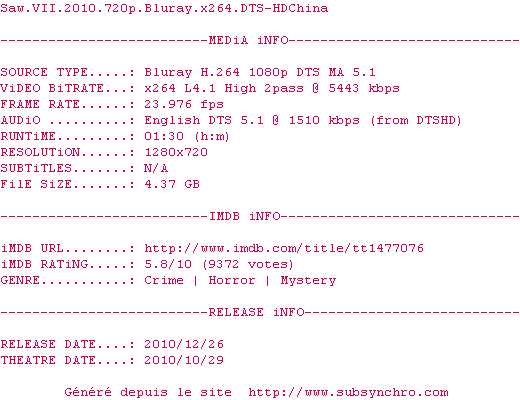 Voir le nfo de la release Saw.VII.2010.720p.Bluray.x264.DTS-HDChina