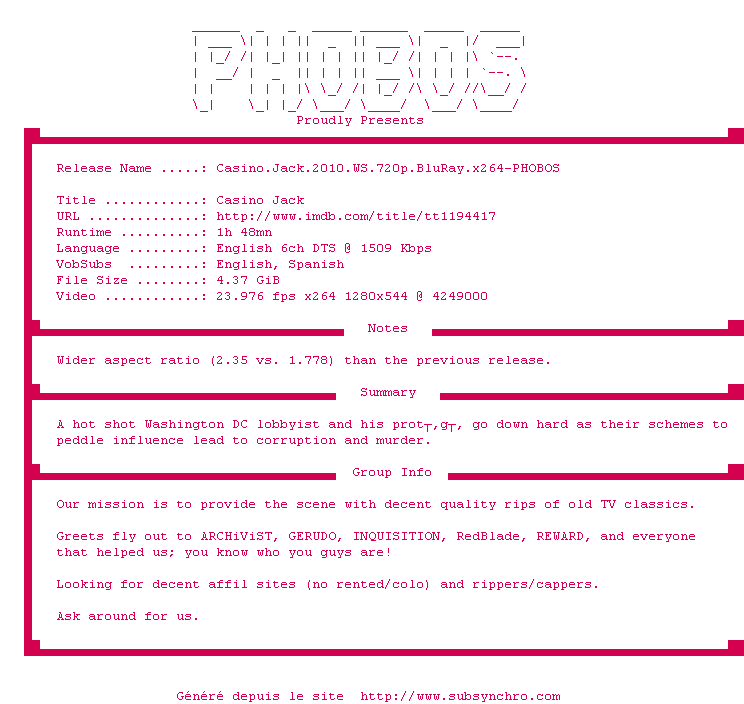 Voir le nfo de la release Casino.Jack.2010.WS.720p.BluRay.x264-PHOBOS