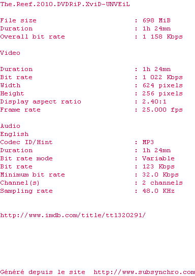 | FOX | The.Reef.2010.DVDRip.XVID-FOX OpenSubtitles | 0 fichier | |||