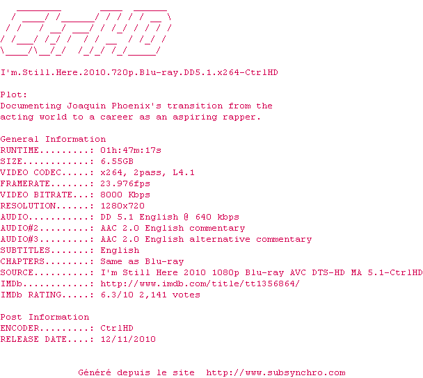 Voir le nfo de la release Im.Still.Here.2010.720p.BluRay.DD5.1.x264-CtrlHD
