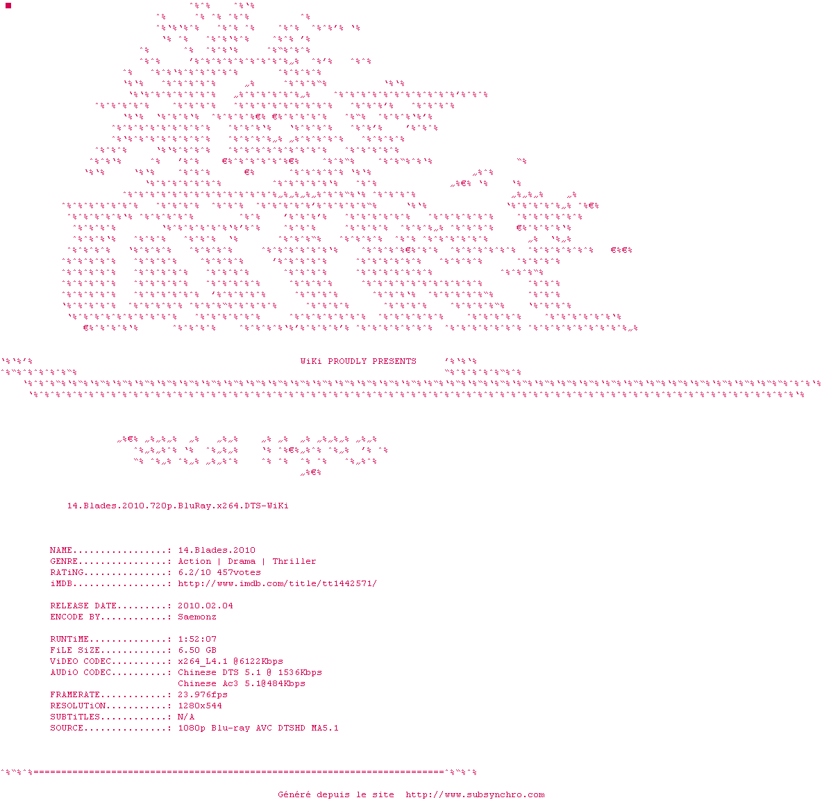 | Voir le nfo de la release 14.Blades.2010.720p.BluRay.x264.DTS-WiKi | WiKi | 14.Blades.2010.720p.BluRay.x264.DTS-WiKi OpenSubtitles | 0 fichier |