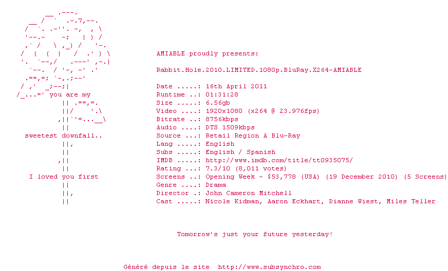 Voir le nfo de la release Rabbit.Hole.2010.LIMITED.1080p.BluRay.X264-AMIABLE